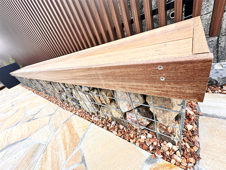 石材を詰めたガビオンと木製座面を組み合わせ、外構全体と一体感のあるベンチ として計画しています。高さや奥行きを現地に合わせて調整し、座りやすさと通行のしやすさに配慮しています。ガビオンの重厚感と天然木のやさしい質感が調和し、無機質になりすぎず空間に落ち着きと表情を与える仕上がりとなりました。