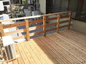 既存スペースを活かした天然木のデッキ工事を行いました。動線と使い勝手を考慮し、手摺を設けた安全性の高いデッキとすることで、実用的な空間に改善しています。また、材料はエコアコールウッドを使用しているため、耐久性も強く、木の質感を活かした仕上がりになりました。