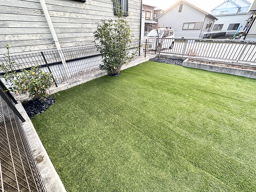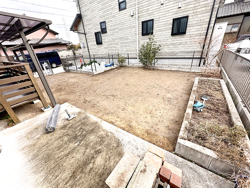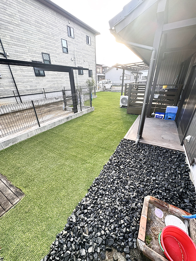 人工芝敷設によるリフォーム外構工事を行いました。施工前は土や雑草の管理が大変な状態で、雨天時には足元が汚れやすいことが課題となっていました。今回、下地処理を行ったうえで人工芝を敷設し、雑草対策と歩きやすさを両立したお庭空間 へと改善いたしました。