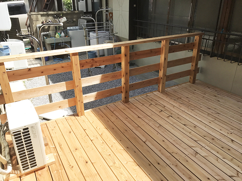 デッキ・フェンス 既存スペースを活かした天然木のデッキ工事を行いました。動線と使い勝手を考慮し、手摺を設けた安全性の高いデッキとすることで、実用的な空間に改善しています。また、材料はエコアコールウッドを使用しているため、耐久性も強く、木の... -